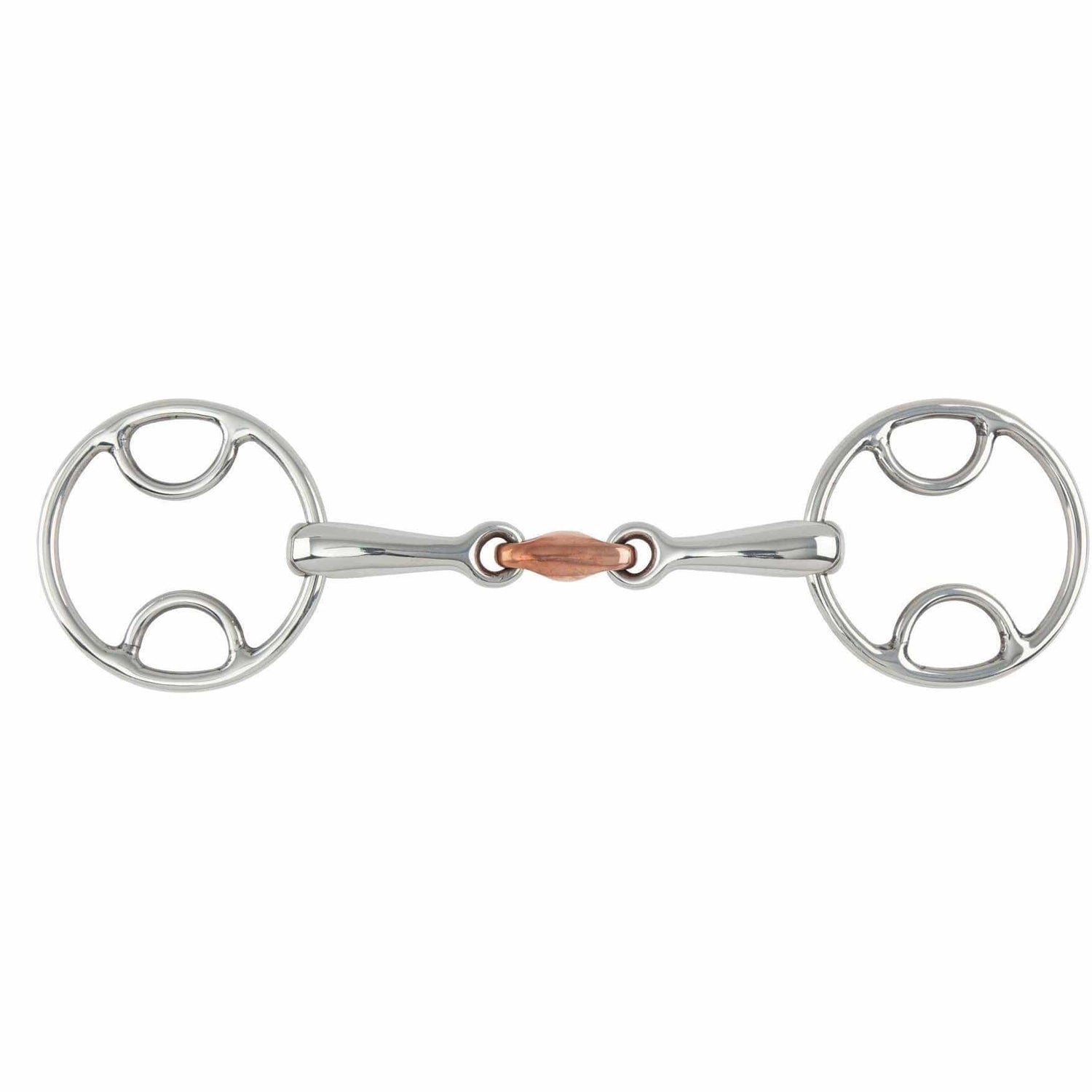 Bevel bit allows mild leverage with a copper lozenge to assist with salivation. From a size 5.25" upwards the ring size increases to keep the bit in proportion for larger horses.