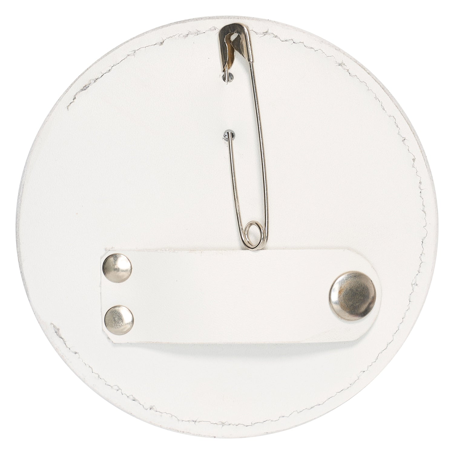 A classic round competition number set with a leather outer. The safety pin and snap button closures ensure secure attachment, and the set accommodates up to three digits.