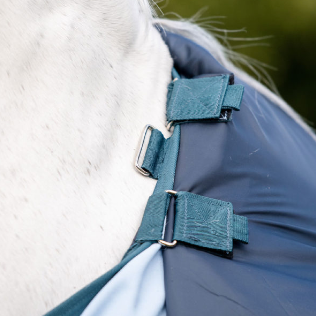 Surefit neck design, sitting further in front of the wither with a smoother slope to cup the front line of the shoulder and finish deeper in the front of the neck, Sure-fit by name and nature, this design gives a snugger fit yet the deeper neck allows more freedom to graze. Always used in conjunction with our V-Front closure, which provides freedom of shoulder movement to prevent rubbing and aids in reducing wither pressure.