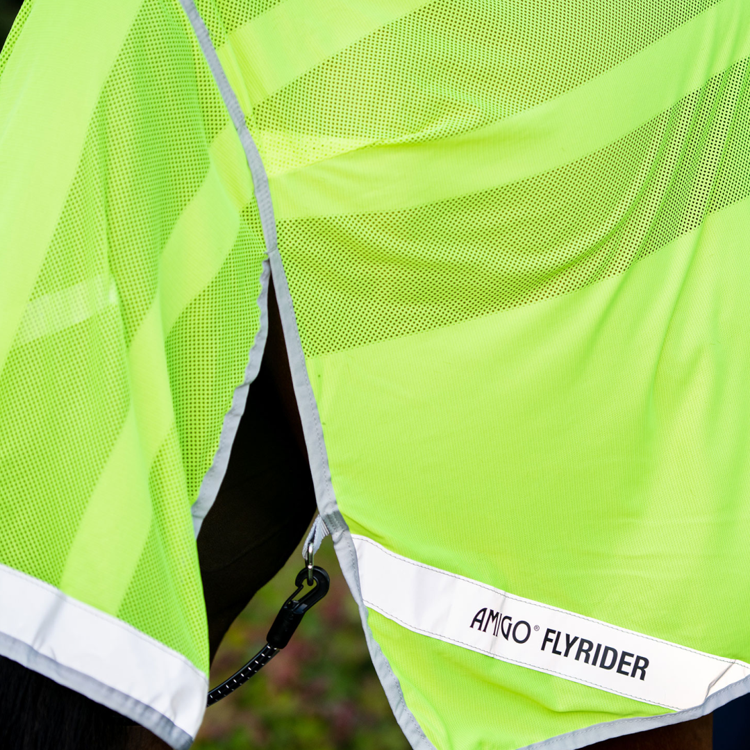 The Amigo® Flyrider has a detachable 'easy fix' hood that protects your horse's neck and shoulders, and an integrated loop attaches to the bridle during exercise. To the back, a generous flap covers your horse's tail with a tail strap and reflective safety strips and trim throughout. The high vis colourway makes this an excellent choice for visibility. A superb addition to our extensive range of fly rugs and a brilliant addition for insect protection under saddle.