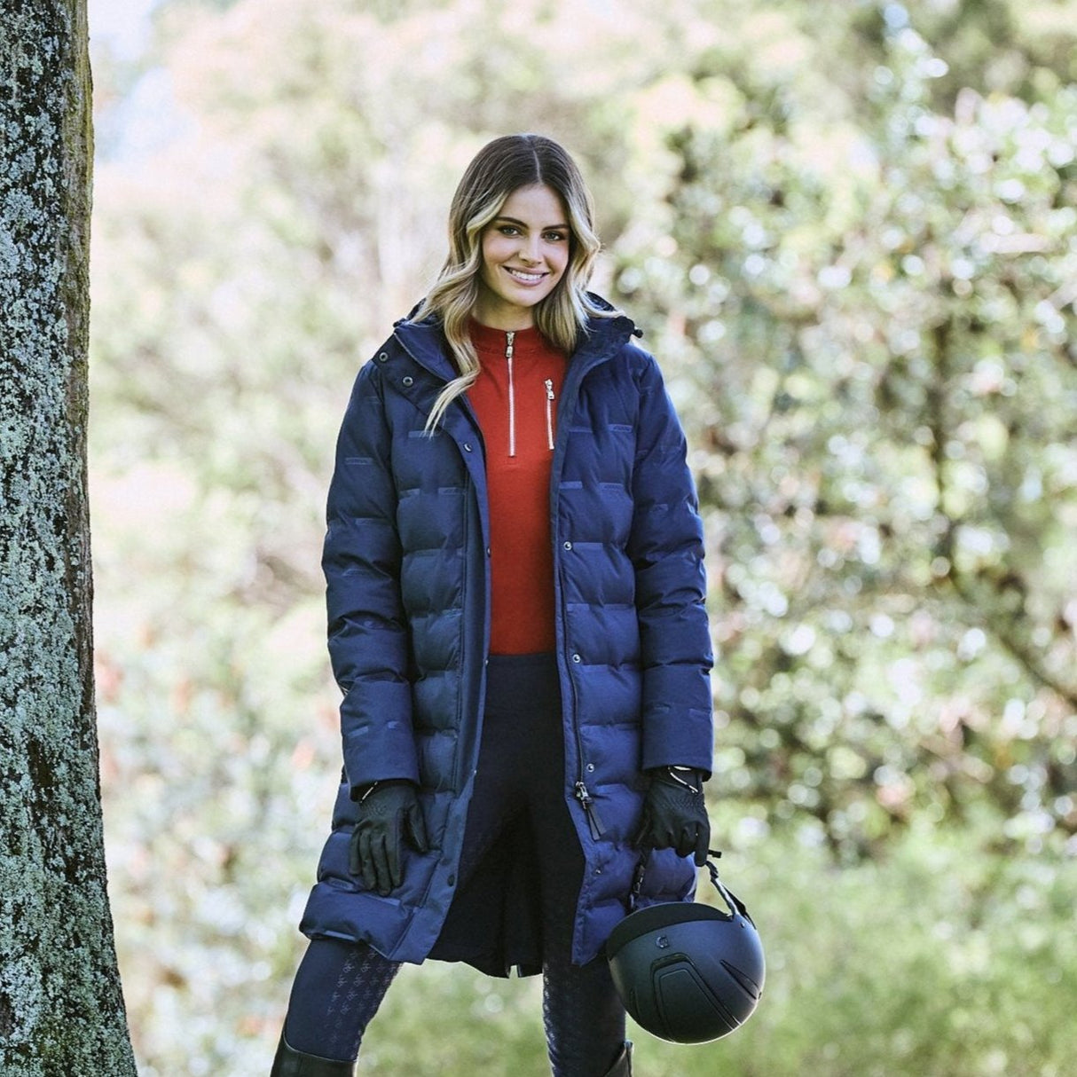 Seal in the warmth with the stylish WeatherBeeta Helsinki Heat Seal Quilted Jacket! Designed with comfort in mind this long line winter coat is sure to keep you warm at the yard this winter. The showerproof outer will protect you in the unexpected showers, whilst the heat seal quilted design remains stylish, ribbed storm cuffs and wadding fill add extra protection keeping you cosy all day long. Featuring a removable hood, with toggles and drawcord, for versatility. Two side pockets with press stud closure are ideal for keeping your hands warm when teaching! With a two way front zip closure and rear gusset with press stud closure allow for freedom of movement when walking or in the saddle. This winter coat comes in Navy and available in Ladies XS - XL.