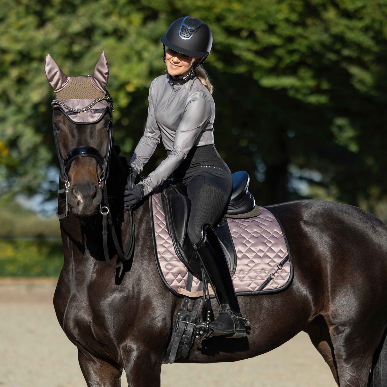 The ear bonnet Golden Bit reliably protects your horse from flies and insects while providing a stylish look. The elasticated ears offer optimum comfort for your horse, while the sophisticated satin look with contrasting colour details adds an elegant accent. A small decorative bit on the front rounds off the design harmoniously and makes the fly veil a real eye-catcher.