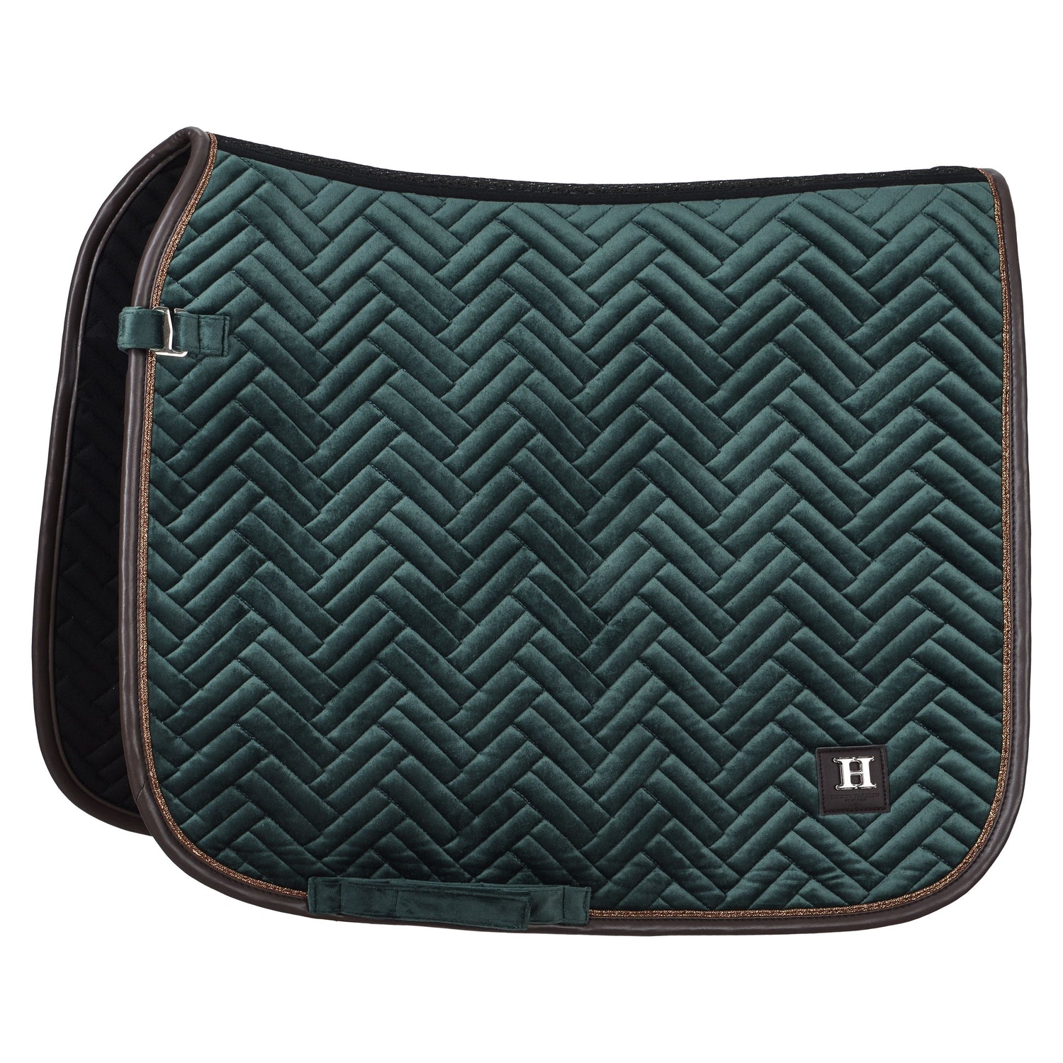 The HVP-Luxury Dressage Saddlepad blends elegance with functionality, making it an outstanding choice for training or competition. Crafted with a luxurious velvet shell fabric and refined double basket weave quilting, it offers a sophisticated look complemented by durable PU leather binding. For the horse’s comfort, the saddlepad features a quick-dry lining and breathable mesh along the backline to promote ventilation and regulate moisture during performance. Finished with a subtle HV Polo logo patch that reflects equestrian heritage, this saddlepad delivers both style and practicality. Made from 100% polyester for both the shell and lining, it is designed for lasting quality and comfort.