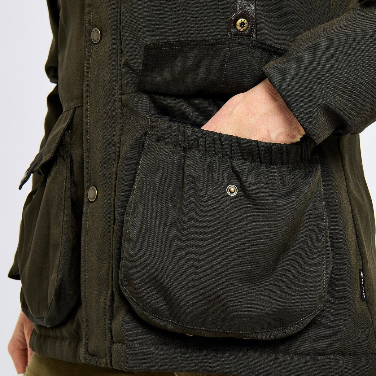 - Fleece-lined chest handwarmer pockets with real leather trim
