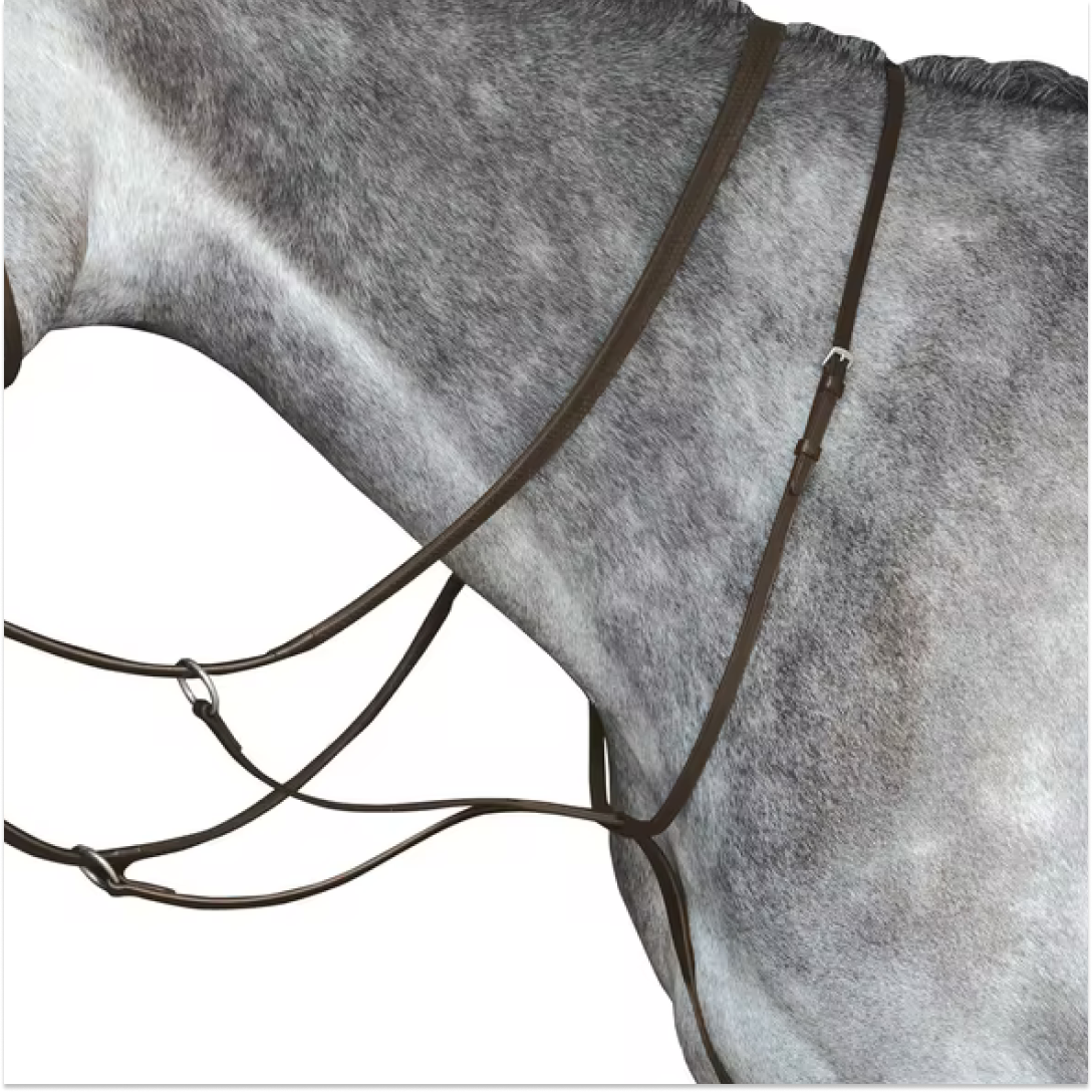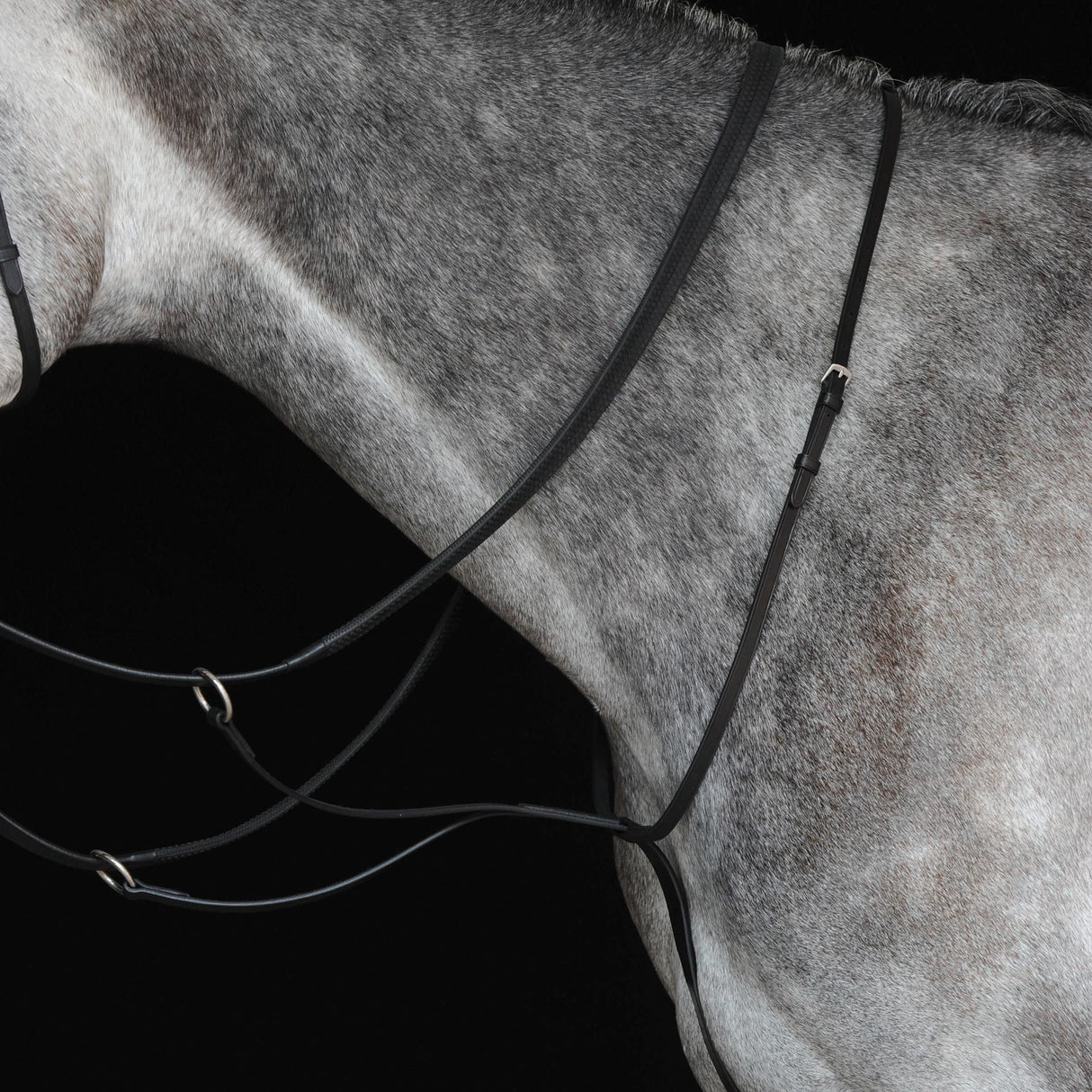 - Das laufende Martingal teilt sich vom Halsband in zwei Riemen auf, an denen sich jeweils ein Edelstahlring befindet, damit die Zügel leicht geführt werden können.