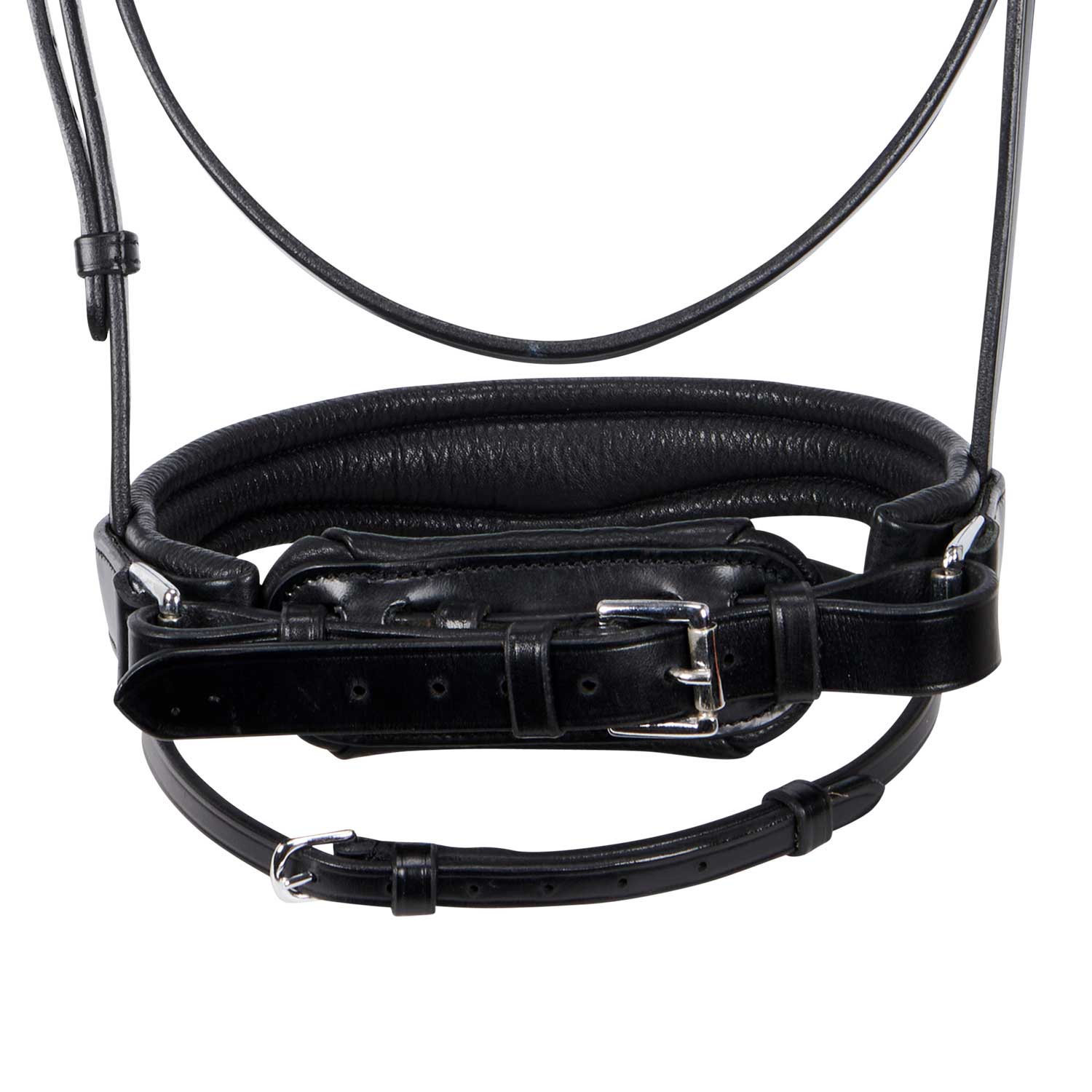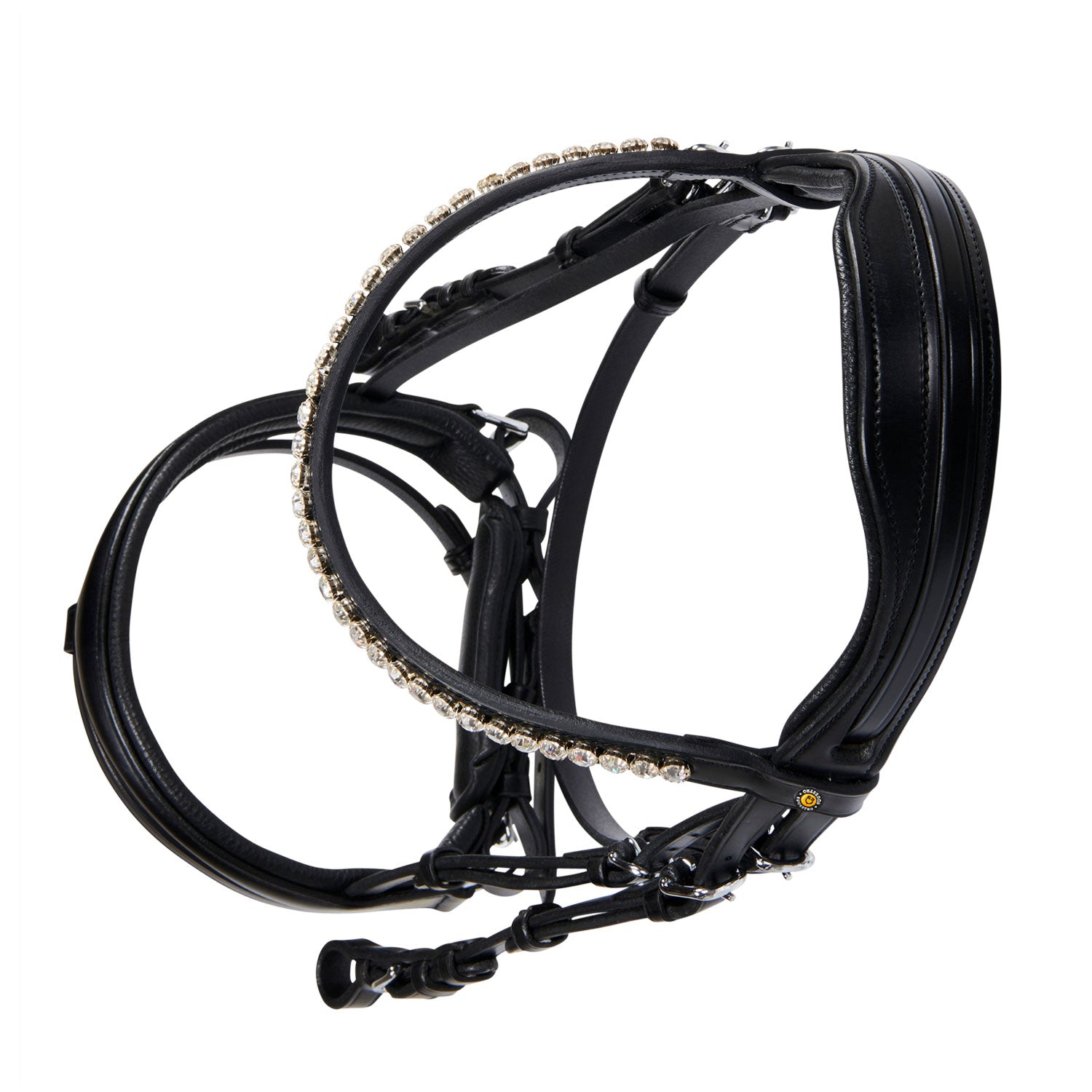 Crafted from high-quality soft Italian leather, this English bridle offers exceptional comfort and freedom of movement. Stainless steel buckles ensure lasting security and durability, while the anatomically shaped overhead distributes pressure evenly for sensitive neck areas. The padded headpiece features a pull-back fastener with a removable protective tab for easy adjustment and a perfect fit. A padded browband adorned with embedded glitter and a metal Equestro logo adds a touch of elegance. Adjustable nose clip and chin strap provide personalized comfort. Reins are not included. Elevate your riding experience with this stylish and functional bridle.