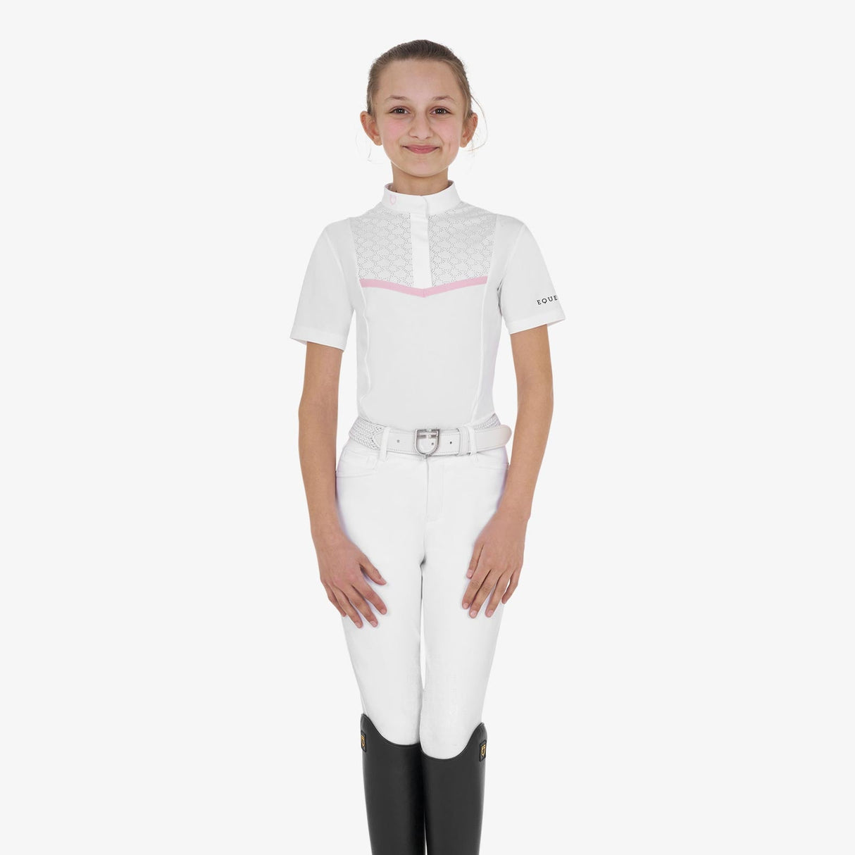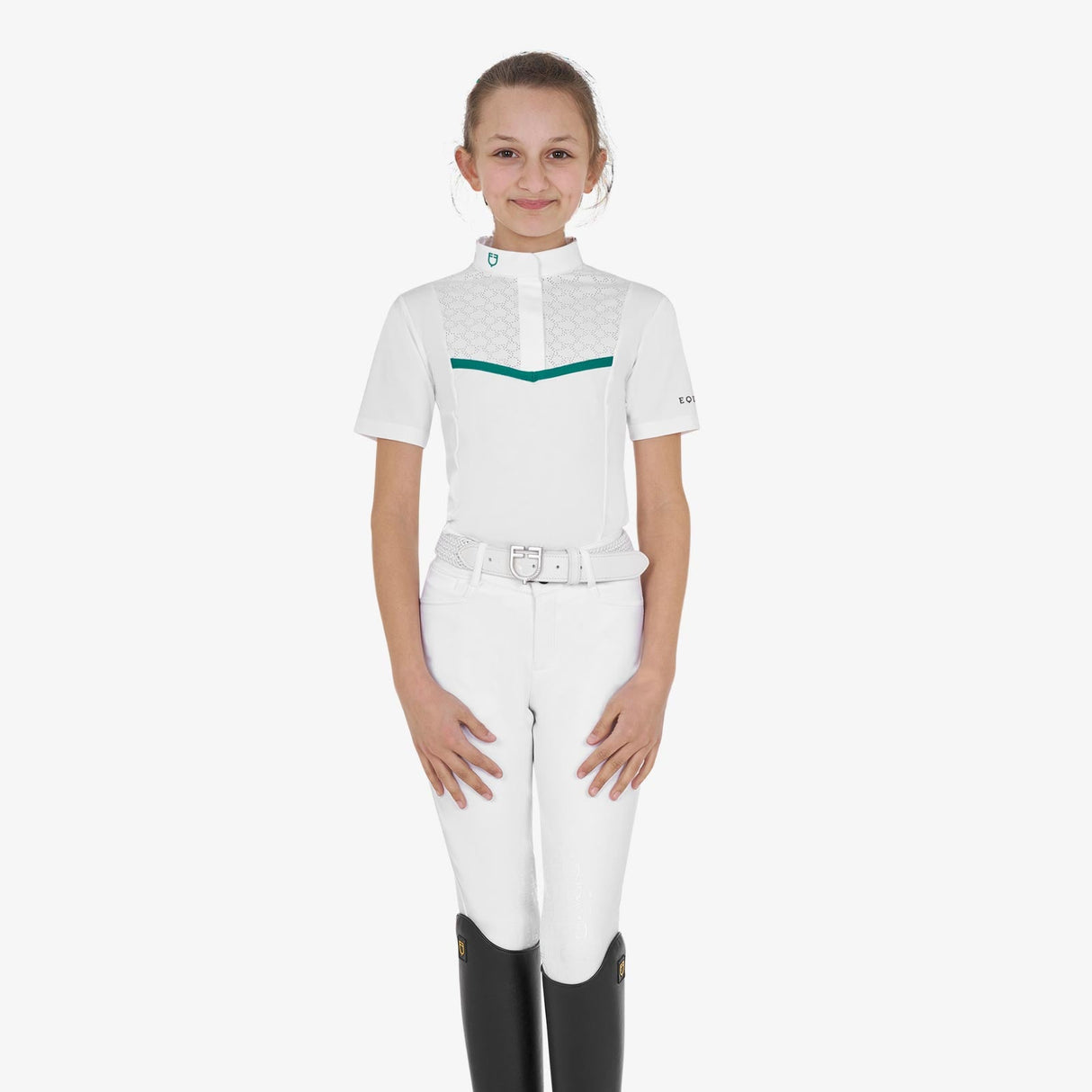 This girls' slim fit competition polo shirt combines style and performance with its innovative breathable and elastic fabric, ensuring maximum freedom of movement during summer events. The tailored cut follows the body’s natural lines without restricting comfort. Perforated inserts on the chest not only add a subtle diamond pattern but also enhance ventilation, promoting quick sweat evaporation in key areas. Designed for both comfort and elegance, this high-quality polo is perfect for competition days and beyond.