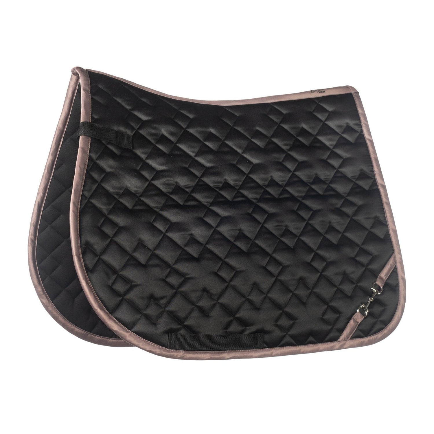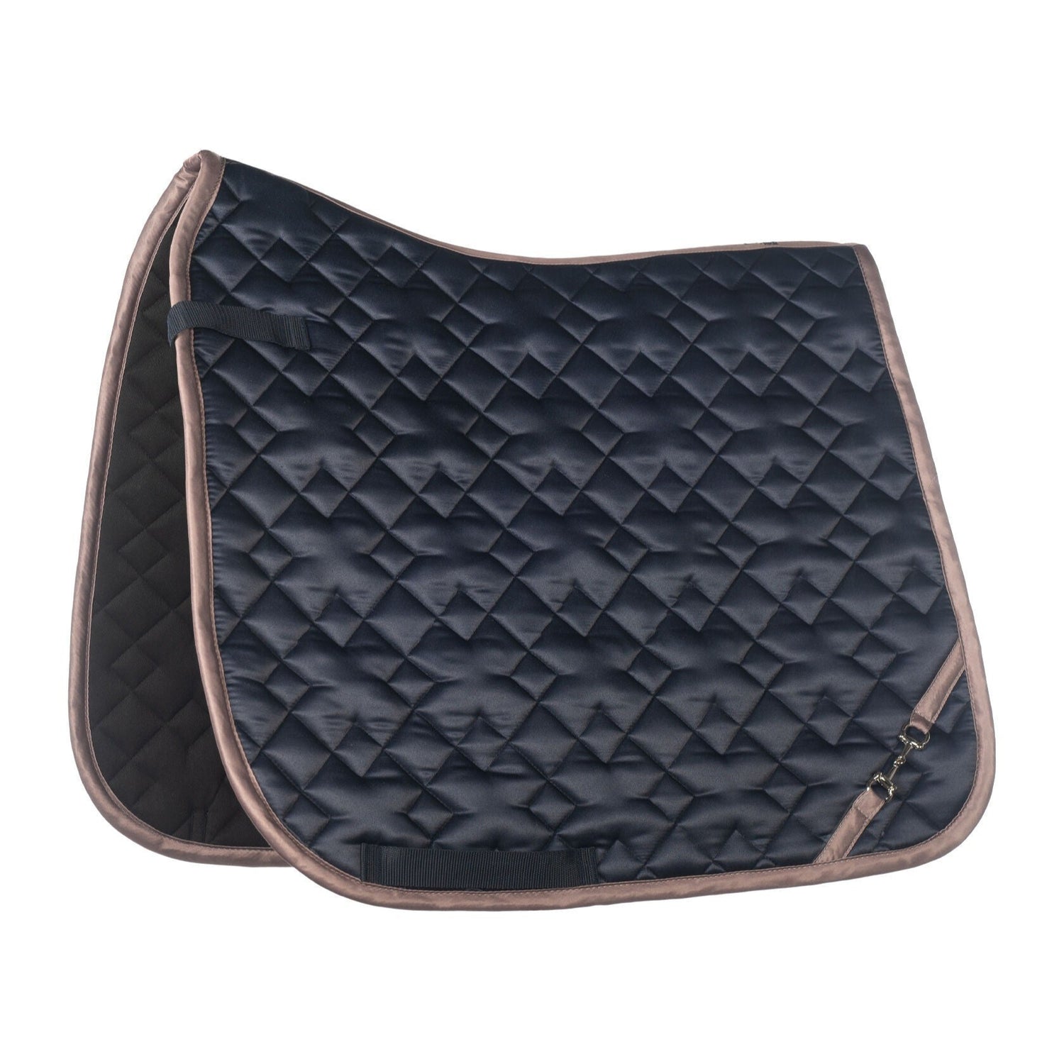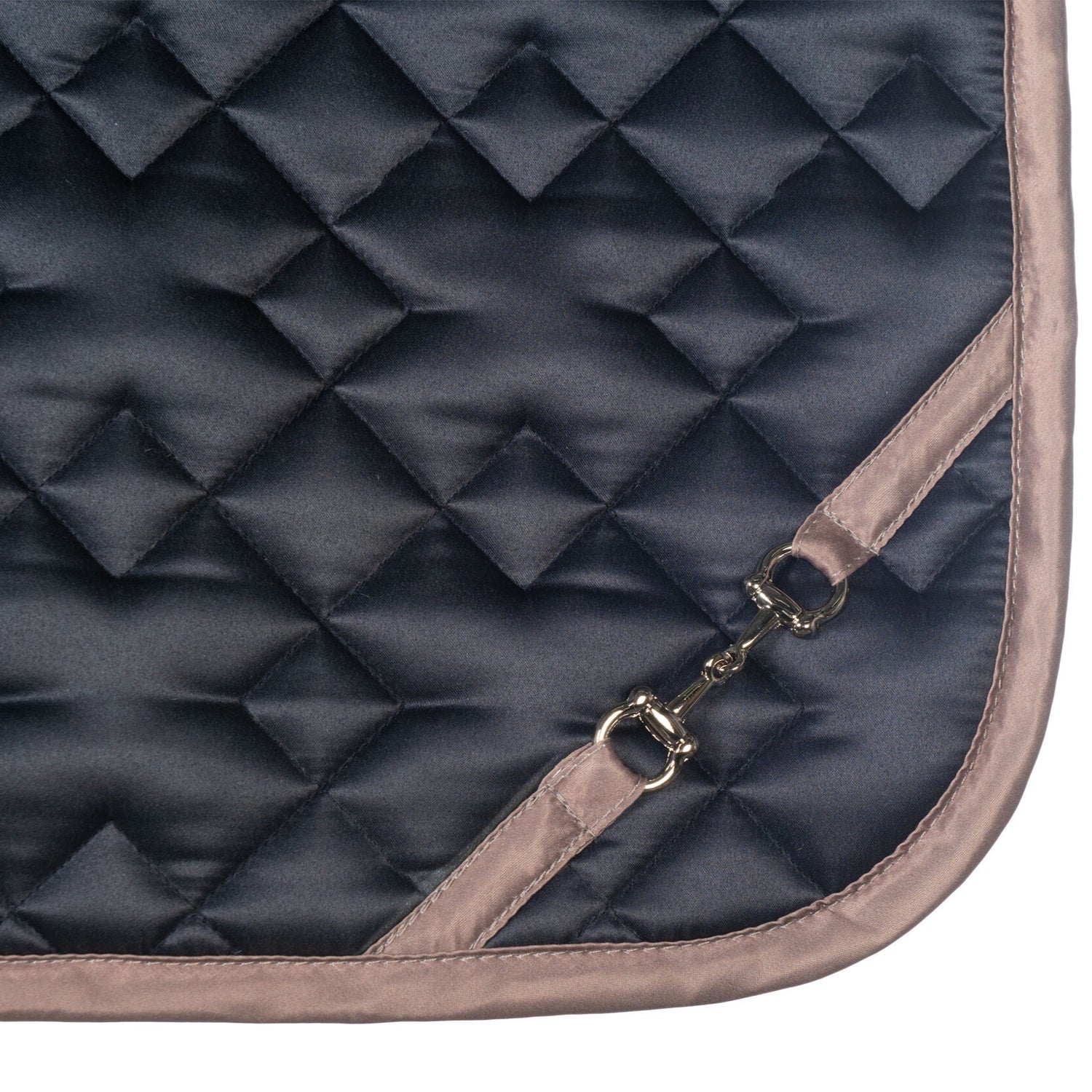 The saddle cloth Golden Bit combines a stylish look with functional features. Thanks to its breathable properties, it ensures a pleasant climate under the saddle, while the foam and wadding filling guarantees optimum pressure distribution. The girth loops ensure a secure hold so that the saddle cloth does not slip. Its high-quality satin look and fashionable quilting give it a sophisticated look, which is further emphasised by the contrasting coloured edging. As a special highlight, the small decorative bit stylishly rounds off the design - a perfect combination of elegance and comfort.