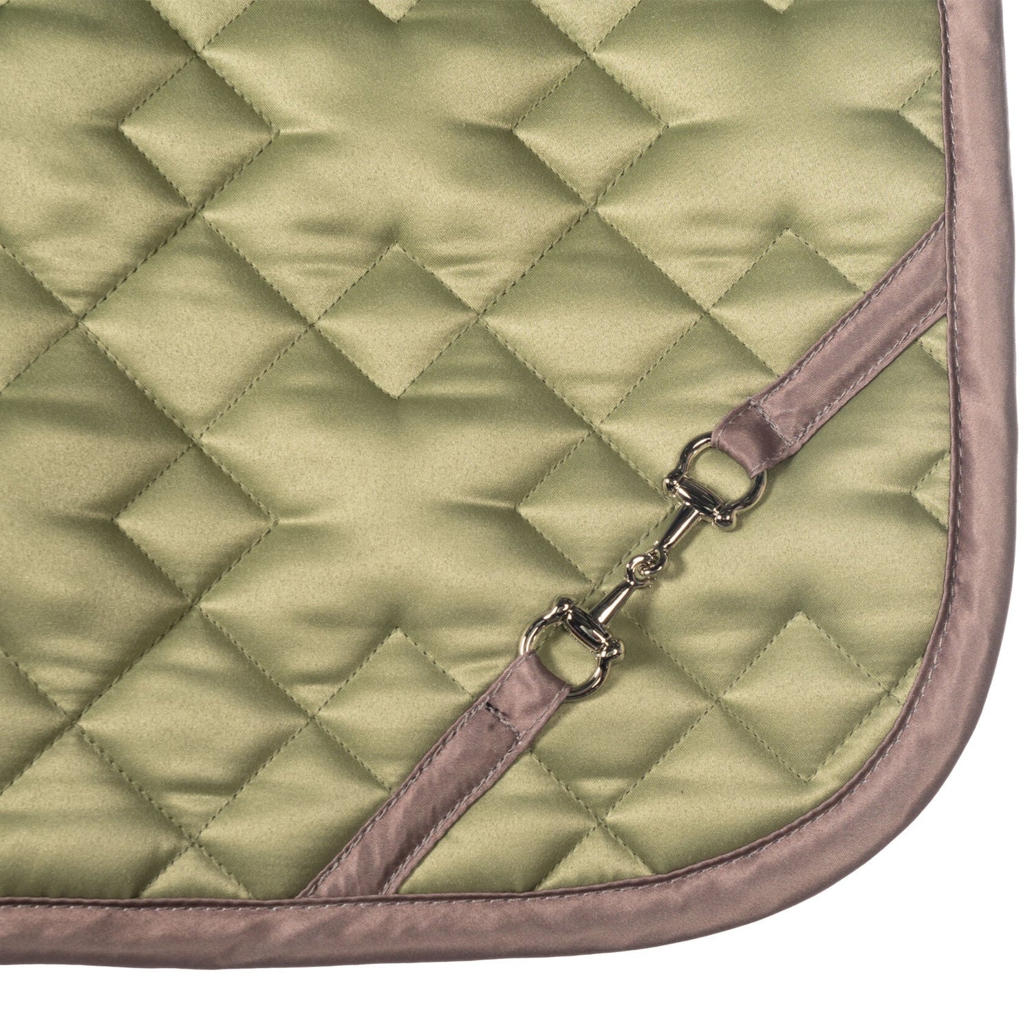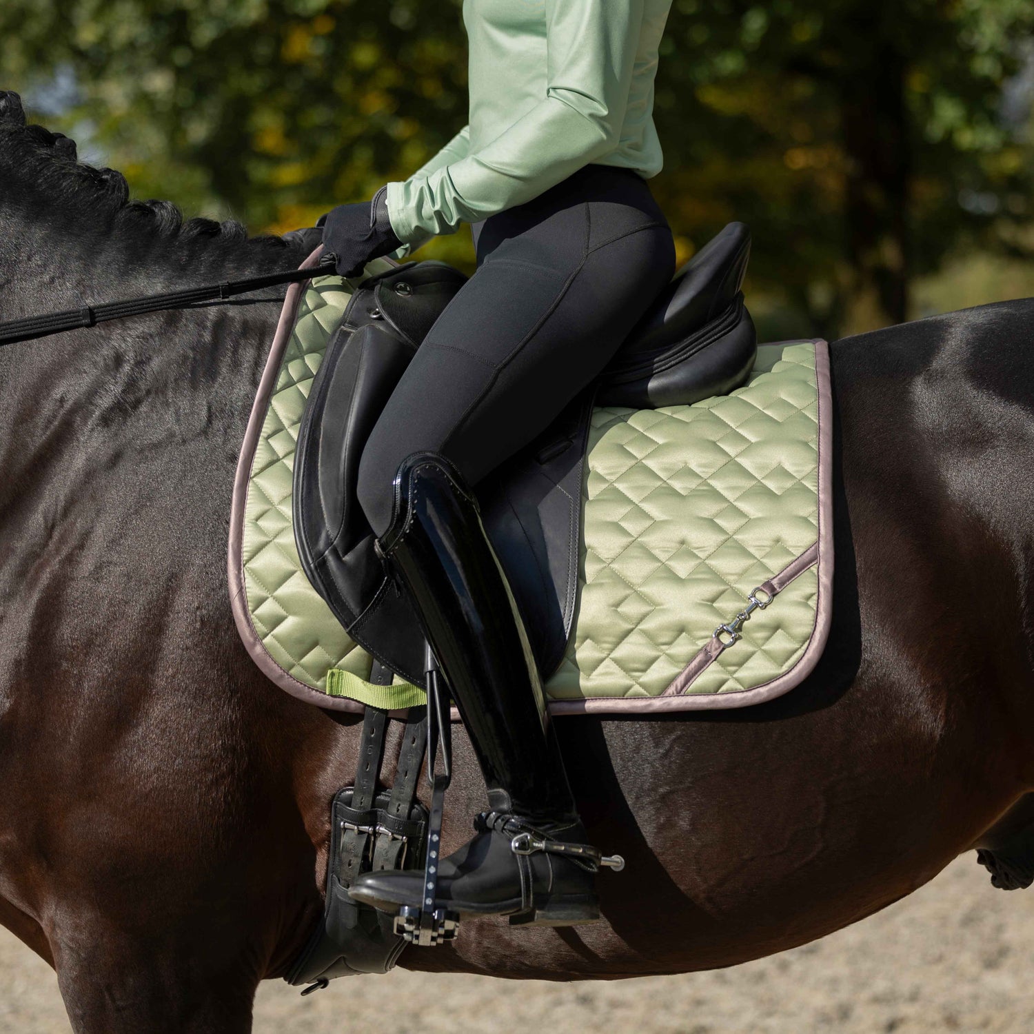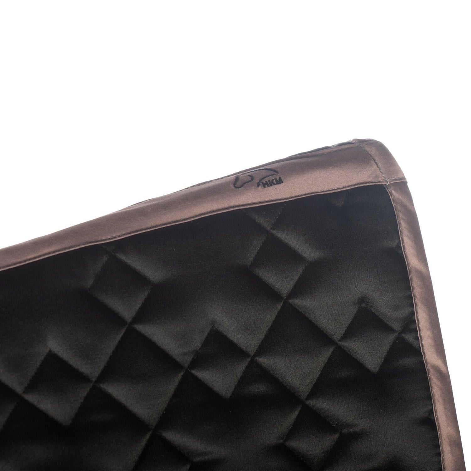 The saddle cloth Golden Bit combines a stylish look with functional features. Thanks to its breathable properties, it ensures a pleasant climate under the saddle, while the foam and wadding filling guarantees optimum pressure distribution. The girth loops ensure a secure hold so that the saddle cloth does not slip. Its high-quality satin look and fashionable quilting give it a sophisticated look, which is further emphasised by the contrasting coloured edging. As a special highlight, the small decorative bit stylishly rounds off the design - a perfect combination of elegance and comfort.