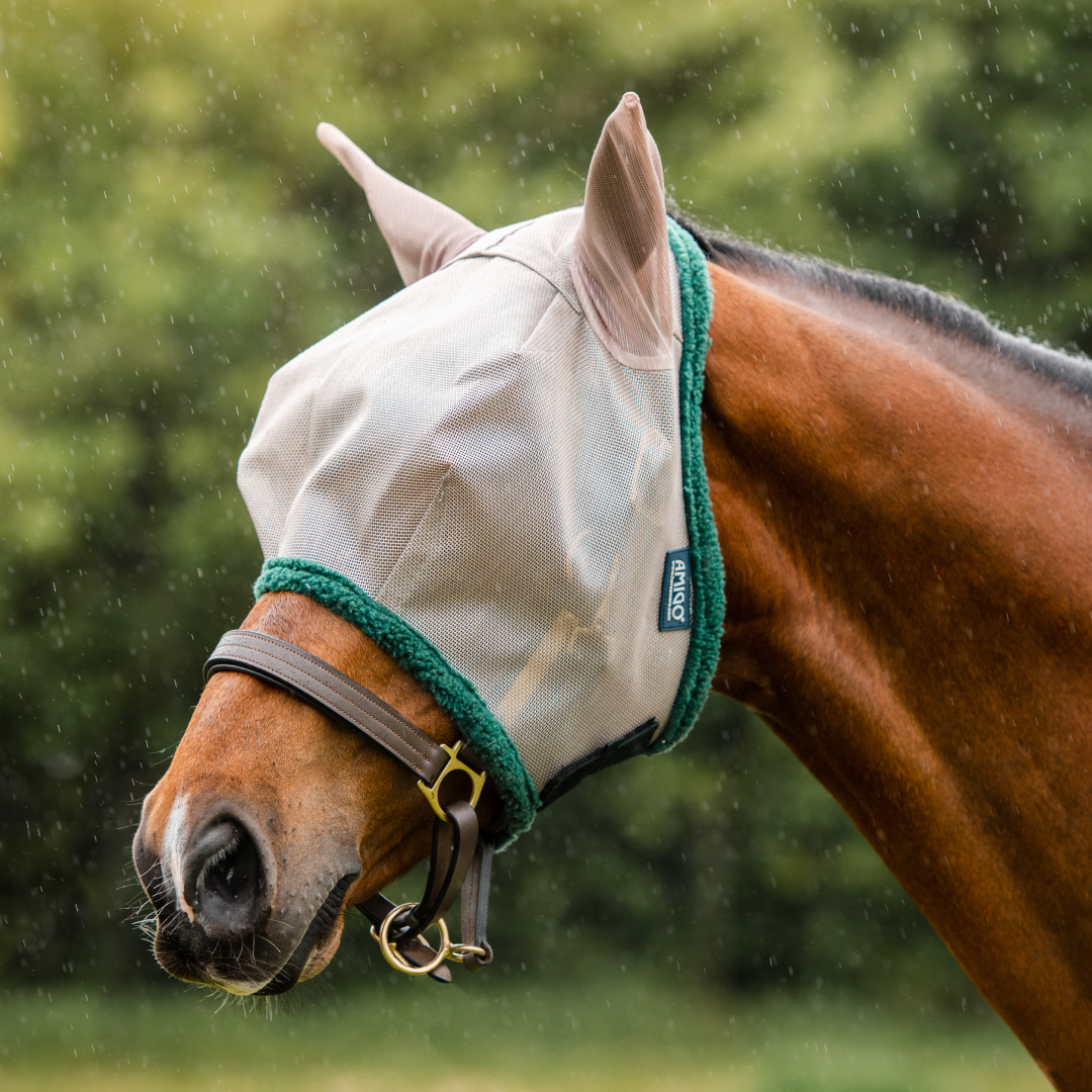 - Profilé pour s'adapter parfaitement à la tête de votre cheval, réduit les irritations causées par les mouches et reflète la lumière du soleil. Disponible dans une série de couleurs pour compléter la gamme de tapis. Les grandes oreilles souples protègent des mouches.