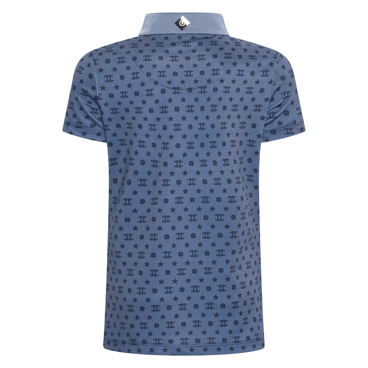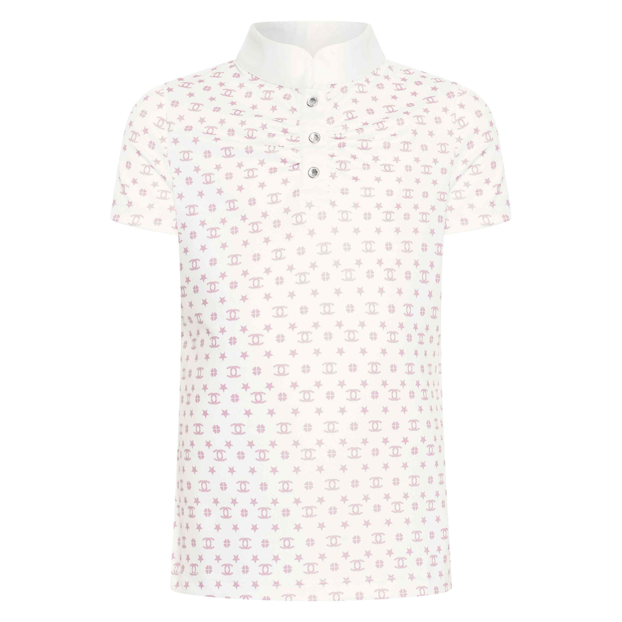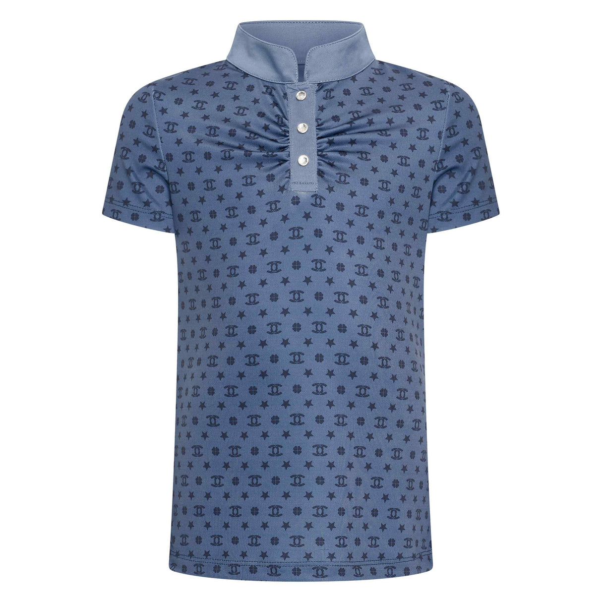 Enhance your child's equestrian style with the Imperial Riding Children's Roxy Tech Top. This competition top features a navy printed design on a white ground, with a white collarstand and fancy rhinestone buttons. The gathering at the chest adds a touch of elegance while the short slit centrefront allows for ease of movement. Perfect for any young rider looking to make a statement in the arena.