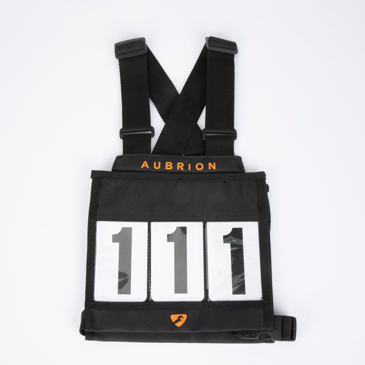 Robust number cards are inserted at the reverse of the display via touch close flaps. Proportioned for children, adjustable shoulder straps allow a snug and secure fit. At the waist are elastic straps, one with a slider and a quick-release buckle for easy entry and securing. Aubrion prints to the front and back.