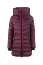 The Cavallo Maya Functional Parka features a sleek, fitted design with a large hood and high-quality label. The hood is adorned with a black drawstring and delicate white print, fastened at the back with a snap. The jacket has diagonal quilting on the upper body and horizontal quilting on the lower body, giving it a unique look.