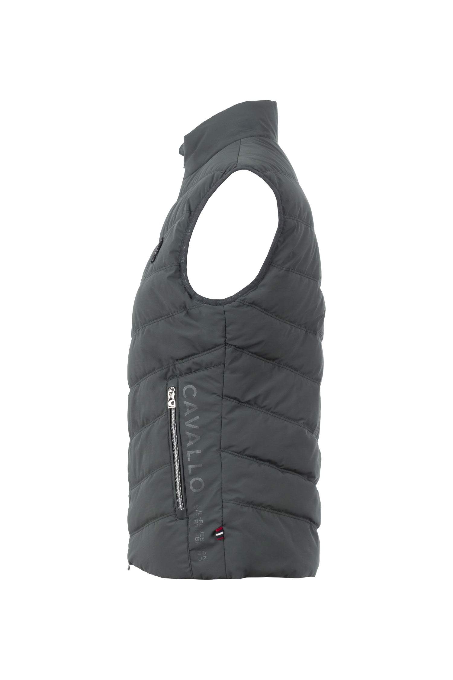 This sporty Cavallo Morlin Quilted Waistcoat is both lightweight and stylish, featuring diagonal double quilting, a stand-up collar with Cavallo stirrup artwork on the back, and two front pockets with silver zips and Cavallo zipper pulls. The cuffs are finished with tonal elastic edging and the left zip pocket displays a tonal Cavallo print. The left chest also bears the Cavallo label and the lining is a dark blue with a tonal Cavallo stirrup print for a sleek and professional look.