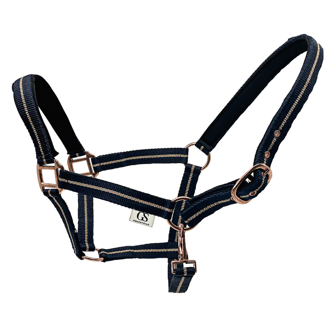 Licol GS Equestrian Lurex Or Rose Détail - Bleu marine/or rose / Poney est en rupture de stock et sera expédié dès qu’il sera de retour en stock.
