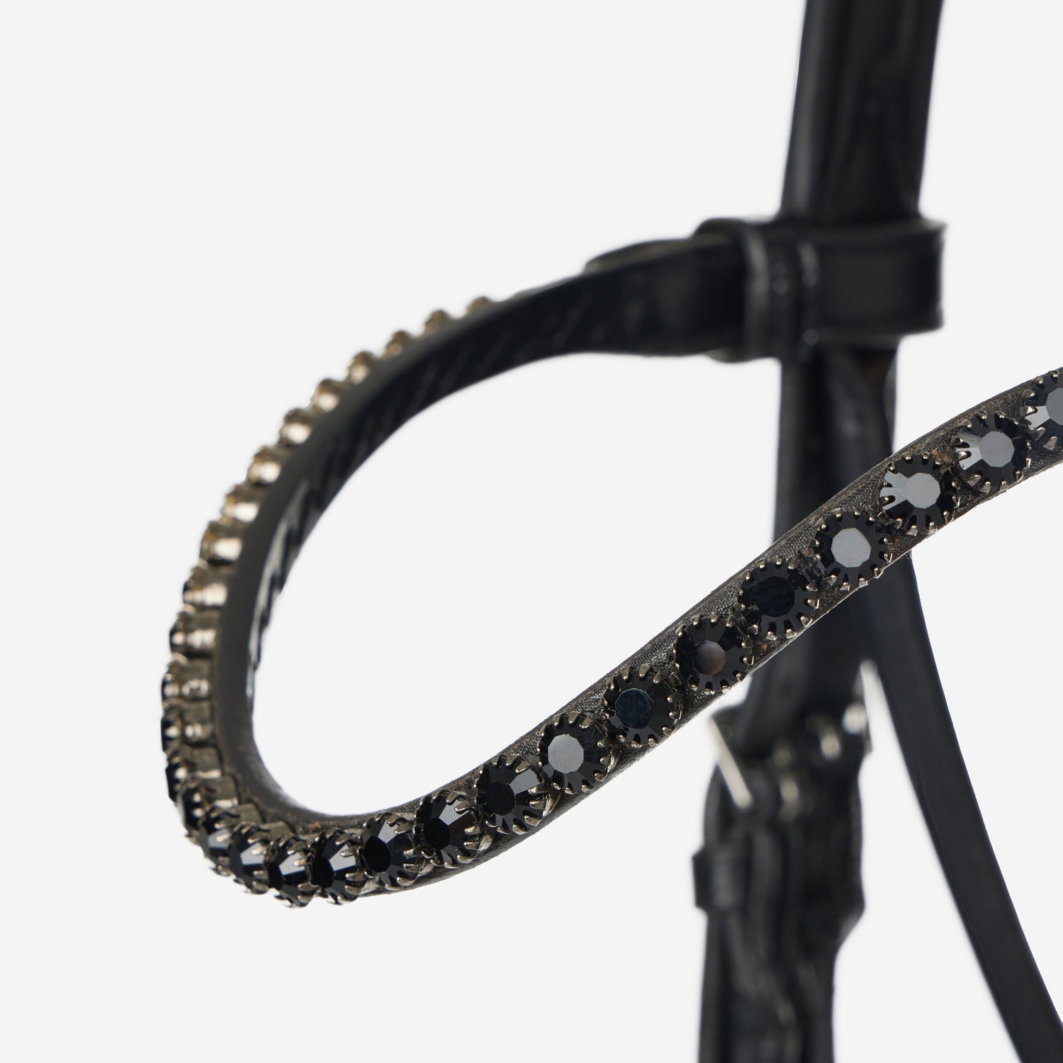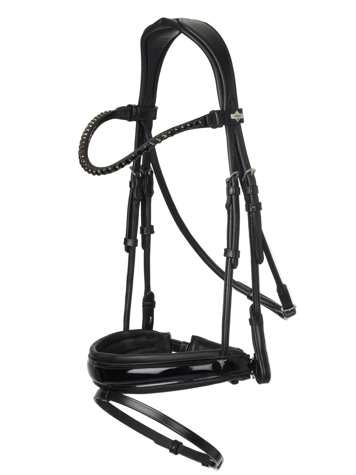The anatomically shaped padded headpiece allows comfortable clearance behind the ears and distributes pressure evenly across the poll. The detachable clincher browband is contoured, padded and crystal-embellished for sophisticated comfort.
