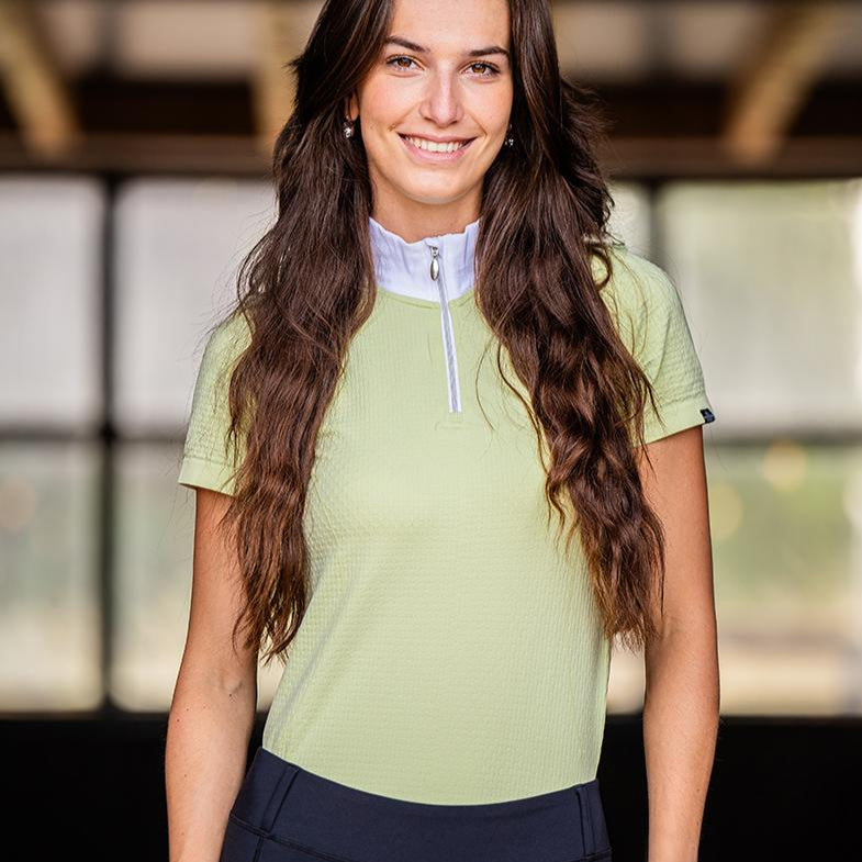 Elevate your riding wardrobe with the Mountain Horse Lily Top, a feminine seamless tech top designed for comfort and style. Featuring a crisp white collar and a sleek silver zipper at the center front, this top combines modern functionality with elegant details. Its seamless construction ensures a smooth fit that moves with you, making it perfect for both training and competition. Experience performance and sophistication in one essential piece.