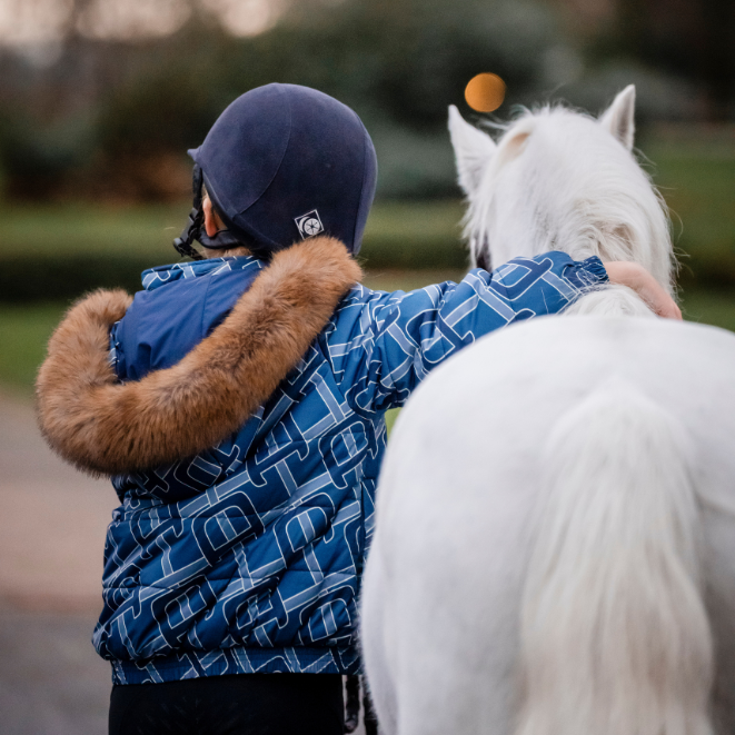 This jacket is filled with 100% Recycled 3M™ Thinsulate™ Featherless Insulation, delivering exceptional warmth for winter riding while remaining lightweight and practical. Crafted from a durable, water-resistant, anti-pill fabric, it ensures long-lasting wear and protection against the elements. A 2-way zip and storm cuffs provide added functionality, while two exterior zip pockets and an interior pocket keep essentials secure. Designed with a roomy fit, it allows easy layering underneath, and the removable hood and fur let you customize your look. Finished with the signature AA monogram all-over print, it blends performance with timeless style.