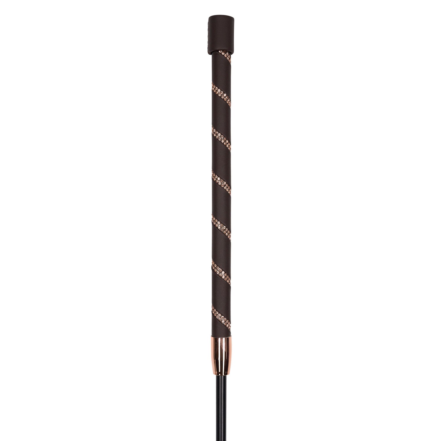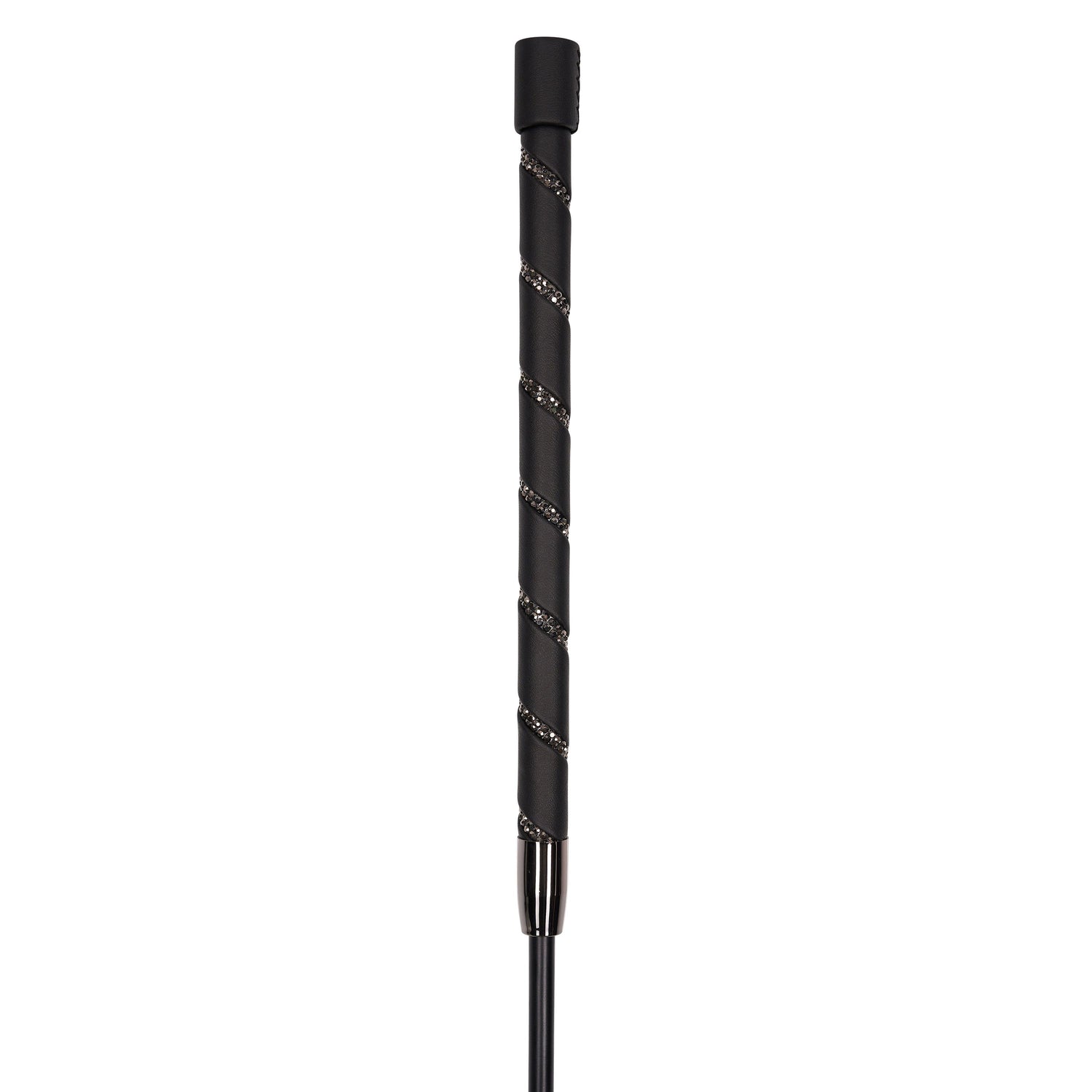 Elevate your dressage with our stiff carbon whip. This innovative material is lightweight and durable. Easy to clean as there is no fabric on it. The swirled rhinestones and debossed logo on top give the whip a luxurious feel.