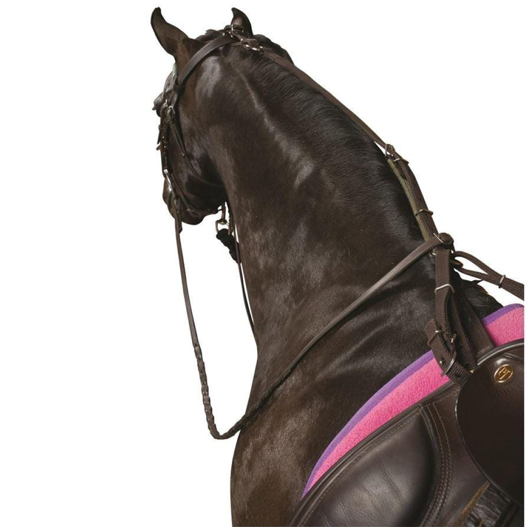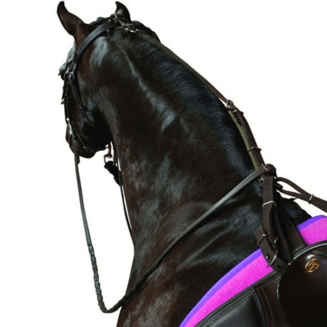 - Adjustable straps run from saddle D-rings to bridle crown preventing the horse from stretching head down past a certain point