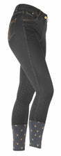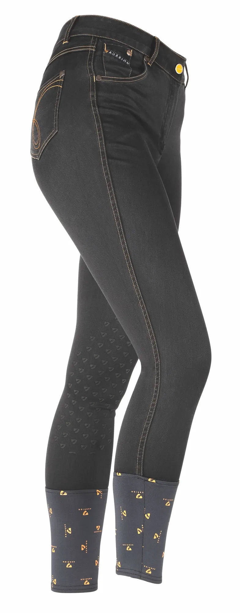 Complete your modern equestrian look with these lightweight jean-style breeches. Style detail: stretch washed denim fabric, mid-rise, belt loops, jean pocket styling, zip fly with enamel button fastener, matte silicone knee grips, stretch lower leg cuffs, leather look Aubrion badge.