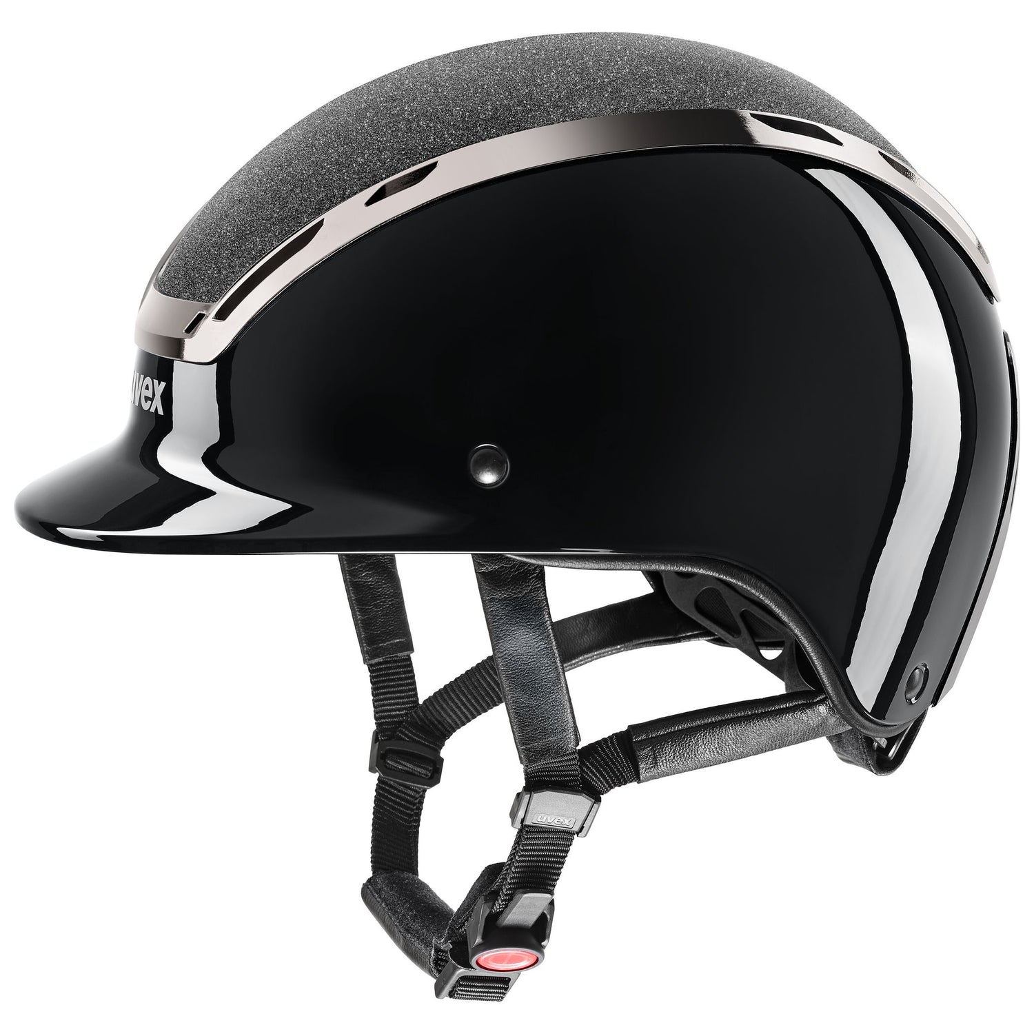 Experience top-tier safety and style with the Uvex Exxeed Blaze riding helmet. Its high-gloss piano lacquer finish and chrome frame deliver a striking look, while the robust hardshell construction with a lightweight EPS core ensures exceptional impact resistance. The innovative uvex 3D IAS system and quick-adjust strap dividers provide a personalized, secure fit. Enjoy enhanced comfort through wide air vents for breathability and soft synthetic leather strap covers. Designed for riders who demand both protection and elegance, this helmet keeps you safe and comfortable during every ride.